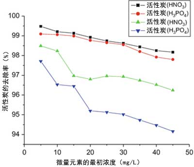 圖2:隨著初始濃度的增加,活性炭對鉛去除百分比的變化。