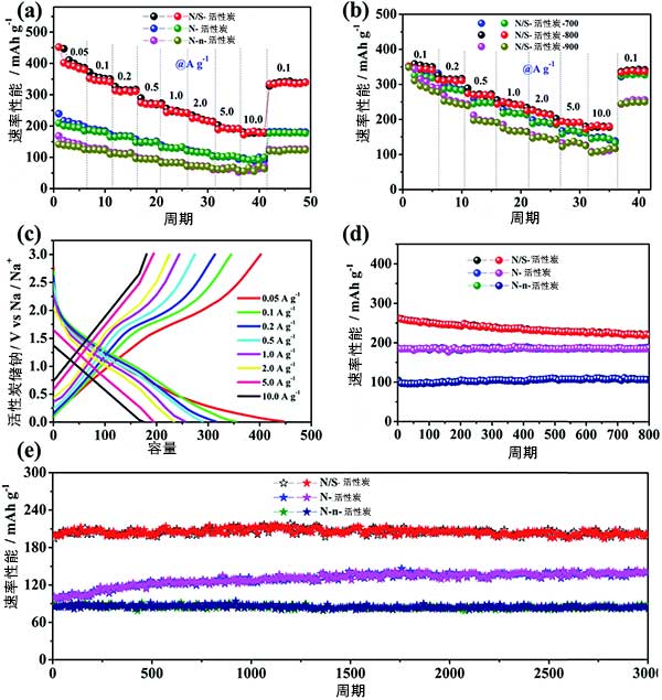 為了進(jìn)一步描述制成活性炭的電化學(xué)行為,進(jìn)行循環(huán)伏安法和恒電流充電放電測試。為了證明活性炭的優(yōu)點(diǎn),還在相同的質(zhì)量負(fù)載下測試了幾種活性炭的Na儲存性能,圖2a顯示了在0.05至10Ag-1的不同電流密度下測試5個循環(huán)。與其他兩個樣品相比,氮硫共摻雜活性炭顯示出優(yōu)異的速率性能,在高速測量之后仍然可以恢復(fù)高比容量。對于沒有S摻雜的活性炭,當(dāng)電流密度增加時,電極提供的容量降低。相比之下,不同電流密度下的恒電流充電放電曲線進(jìn)一步證實(shí)了這些速率的結(jié)果。因此,氮硫共摻雜活性炭電極表現(xiàn)出比其他對照樣品好得多的速率性能和優(yōu)異的鈉儲存性能。