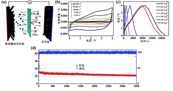 如圖3a所示,使用氮硫共摻雜活性炭作為陽極并且商業(yè)活性炭作為陰極在電解質(zhì)溶液中構(gòu)建的鈉離子電容器裝置。在充電過程中,ClO 4-離子在活性炭的多孔結(jié)構(gòu)中被吸收,而來自電解質(zhì)的Na離子被插入到氮硫共摻雜活性炭中。放電過程與充電過程相反。在制造鈉離子電容器之前,氮硫共摻雜活性炭電極在預(yù)活化10個循環(huán)在Na離子半電池中獲得高效率,然后放電至0.01V的截止電壓。此外,研究了活性炭作為陰極的電化學(xué)性能,以評估陰極和陽極之間的電荷平衡。活性炭的比表面積高達(dá)1500以上。根據(jù)活性炭陰極和氮硫共摻雜活性炭陽極的比容量值,鈉離子電容器中氮與硫摻雜活性炭的質(zhì)量比為3:1。