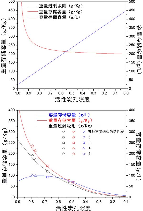 圖4顯示了兩種活性炭的重量和體積存儲容量之間的相互依賴性。實驗吸附測量與第二模型一致,將孔隙率和表面積作為因變量處理。經(jīng)過對比活性炭樣品的實驗性過量吸附,重量儲存容量和體積儲存容量。圖3和圖4將理論模型與實驗數(shù)據(jù)進(jìn)行比較。它表明,所開發(fā)的模型是通用的,并預(yù)測任何活性炭樣品的重量和體積儲存容量之間的相互依賴性。結(jié)果也適用于金屬有機骨架。雖然實驗結(jié)果比較好的活性炭不具有較高的表面積,但孔隙率在0.65和0.75之間。通過使用化學(xué)粘合劑將活性炭粉末壓縮成整料,實現(xiàn)了更高的體積儲存容量。整體的體積儲存容量使用整體式整體密度而不是活性炭的表觀密度或金屬有機框架材料的單晶密度來計算。