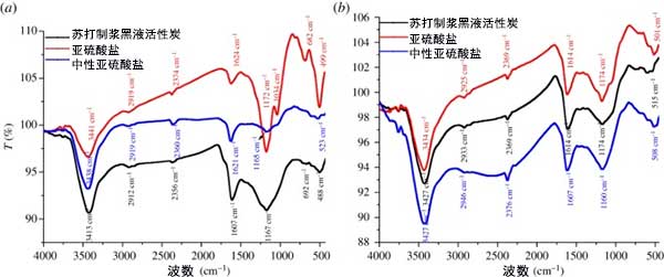 FTIR光譜和SEM在表面功能基團并根據(jù)該制漿工藝的研究基于活性炭的形態(tài)學的變化在圖2示出。關于FT-IR光譜(圖3a,b),很明顯活性炭的表面具有強帶,其分配為酚木質(zhì)素,羧酸或吸附水的OH伸縮。因為蘇打制漿導致從原料中更高的二氧化硅去除,并且因此黑液中的二氧化硅含量更高。發(fā)現(xiàn)不同官能團為特征的活性炭表面已準備好進行吸附過程。