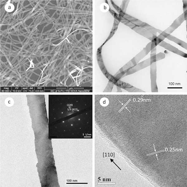 圖1顯示了在活性炭上生長的銀納米帶的典型電子顯微鏡(EM)圖像。SEM圖像(圖1a)顯示獲得了豐富的線狀產(chǎn)物,具有非常少的準(zhǔn)球形顆粒雜質(zhì)。圖1b是銀納米帶的典型TEM圖像。該圖中所示的納米帶的平均寬度為約45納米。從左側(cè)附近的扭曲納米帶測量的厚度為約9納米。位于TEM網(wǎng)格上的這種平坦且光滑的納米結(jié)構(gòu)也通過右側(cè)的莫爾圖案來證實,其源自具有不同晶體取向的兩個或三個納米帶的堆疊。圖1c呈現(xiàn)單個納米帶的TEM圖像。其選擇區(qū)域電子衍射(SAED)圖案插入右上角,具有六重對稱性。