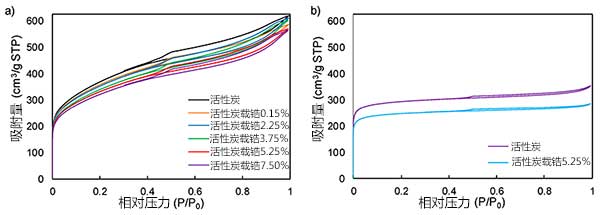 圖1:(a)化學活性炭在不同鋯負載之前和之后的-196℃下的氮吸附-解吸等溫線。(b)在鋯載荷為5.25%之前和之后的物理活性炭。
