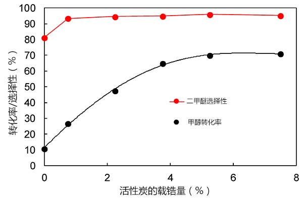 圖2:穩(wěn)態(tài)甲醇轉(zhuǎn)化率和對二甲醚的選擇性活性炭的鋯負載的變化。