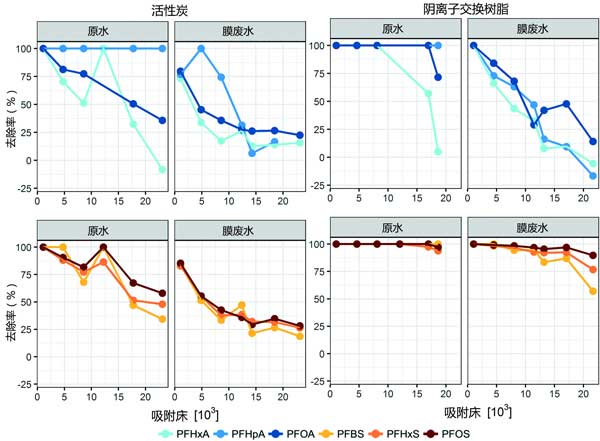 實(shí)驗(yàn)總計進(jìn)行了12周,每兩周取樣。這導(dǎo)致所有活性炭色譜柱的實(shí)驗(yàn)運(yùn)行時間為24個,分別處理原水和膜廢水的陰離子交換樹脂色譜柱。在每次采樣之后每周對所有柱進(jìn)行反洗,以模擬典型的全尺寸操作。總共分析了15種全氟烷基物質(zhì),將吸附材料相對于全氟烷基物質(zhì)去除的性能與柱吸附模型的性能進(jìn)行了比較。