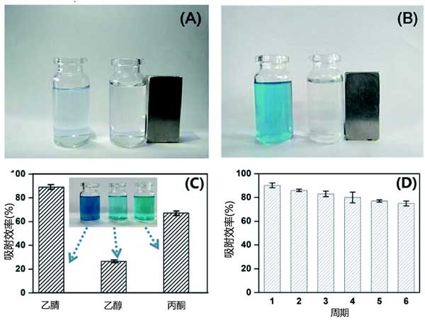 圖3:未加標(A)和加標(B)孔雀石綠廢水中活性炭吸附性能的照片,解吸溶液(C)的影響和活性炭的可重復(fù)使用性(D)。