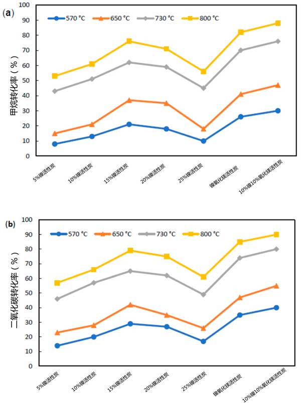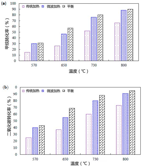 圖2:(a)二氧化碳和(b)甲烷轉(zhuǎn)化率。