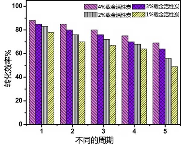 為了量化活性炭載金催化劑的催化活性,可以使用轉(zhuǎn)換頻率作為度量。轉(zhuǎn)換頻率可以定義為使用每克活性炭每單位時間轉(zhuǎn)化成產(chǎn)物(對氨基苯酚)的反應物分子(對硝基苯酚)的數(shù)量;钚蕴枯d金催化劑是可回收的,每次運行后,通過離心分離催化劑。即使使用5次,催化劑的轉(zhuǎn)化率最多降10%。這通過繪制百分比轉(zhuǎn)換效率與循環(huán)次數(shù)來顯示,如圖3示。