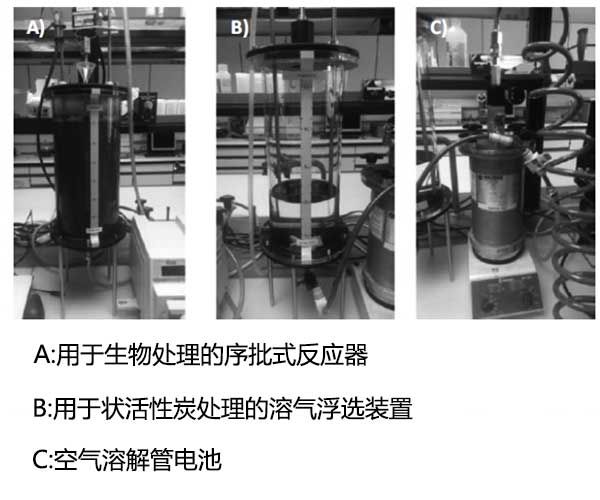 污水處理廠的活性污泥用于承載微生物,收集活性污泥并對其主要參數(shù)進行表征銨,硝酸鹽,亞硝酸鹽,磷酸鹽,化學需氧量,生物需氧量,總懸浮固體和pH每周一次,并儲存在4°C直至使用。將5L活性污泥泵入生物處理的序批式反應器,混合并充氣2小時,然后使污泥靜置30分鐘。將1.7L上清液轉移至活性炭處理的溶氣浮選裝置單元,其中加入粉末狀活性炭并混合(30分鐘)。下一步包括加入凝結劑聚氯化鋁,12分鐘后加入絮凝劑。最后,將飽和水注入活性炭處理的溶氣浮選裝置裝置,開始分離步驟(12分鐘)。整個過程持續(xù)了大約四個小時。