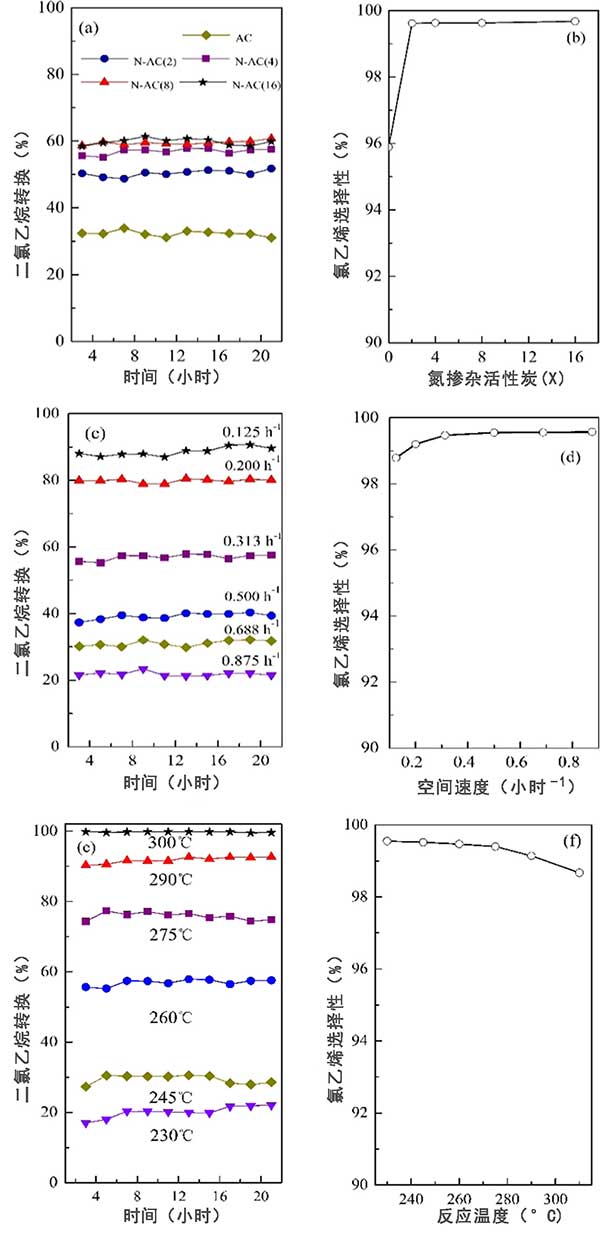 c、顯示出二氯乙烷轉(zhuǎn)換為初始氫的一半,而氯乙烯選擇性是在任何時候都在99%以上。結(jié)果表明氮摻雜活性炭催化劑具有良好的穩(wěn)定性。