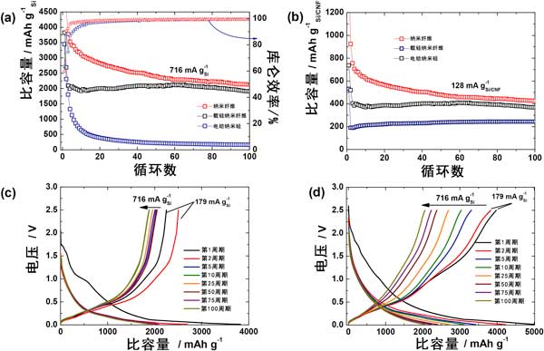 如圖4所示,從第一個循環(huán)的電壓分布中看出,兩個陽極的第一個循環(huán)的額外貢獻(xiàn)來自不可逆的固體電解質(zhì)界面層形成和電解質(zhì)分解。對于電化學(xué)表征,在紐扣電池配置中使用鋰金屬作為對電極對所有硅陽極進(jìn)行恒電流充電和放電。裸露的十億分之一硅陽極在第一個循環(huán)中提供3445mAhg的放電容量,庫侖效率約為65%。從第二個循環(huán)開始,二氧化硅的硅載納米纖維陰極的比容量值急劇下降至2600mAhg,而納米纖維的靜電紡絲陽極顯示出邊際下降,比容量為4000mAhg-1,庫侖效率均為約91%。比容量的急劇下降可歸因于二氧化硅的硅載納米纖維中的二氧化硅殼在第一次循環(huán)中不可逆鋰化。