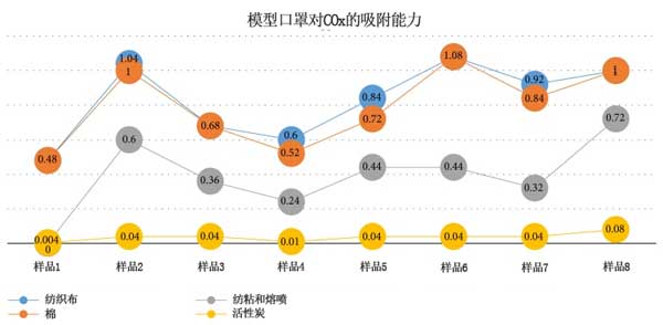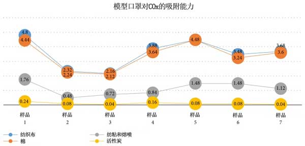 活性炭組合口罩模型組在吸收COx方面比其他口罩模型具有更高的能力。不使用口罩/控制3.40 ppm(吸入氣體)檢測COx廢氣排放的平均結(jié)果高于使用其他口罩,即棉布材料3.39 n/mm3,紡粘和熔噴1.13 ppm以及0.10ppm的活性炭組合材料,紡粘和熔噴的口罩(參見圖1)。