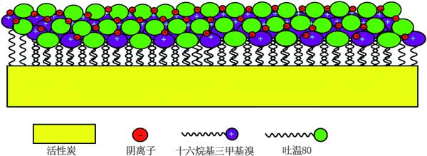 用表面活性劑改性的活性炭在電吸附過程中具有潛在的應(yīng)用,其中表面電荷和潤(rùn)濕性起重要作用。用離子表面活性劑功能化的活性炭電極最近在電容去離子技術(shù),特別是反向電容去離子系統(tǒng)中引起了相當(dāng)大的關(guān)注。圖3表明在用吐溫80和HDTMA的二元混合物改性的活性炭上吸附陰離子。吐溫80的存在表明HDTMA的吸附密度增強(qiáng),完美填充(高穩(wěn)定性),這在電吸附過程中都是值得的。實(shí)際上,HDTMA的增強(qiáng)的吸附密度誘導(dǎo)了陰離子污染物的高吸附能力。此外,改進(jìn)的填料賦予表面活性劑在表面上的穩(wěn)定性。這些特殊效果是混合表面活性劑體系應(yīng)用的最終目標(biāo)之一,為了提高活性炭的表面活性,對(duì)于單一表面活性劑體系來(lái)說,這是不可能發(fā)生的。