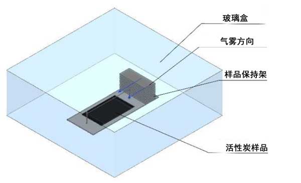 活性炭關(guān)于電場附增強(qiáng)吸附測試設(shè)備,由一個(gè)樣品架組成,樣品架放置在一個(gè)33厘米×33厘米×12厘米的帶有硼硅酸鹽玻璃壁的盒子內(nèi)(圖3)。風(fēng)扇(位于偏轉(zhuǎn)板后面)引起平行的空氣通量到樣品。在細(xì)的(直徑為180 µm)鎢絲電極(放電電極)上施加正電勢,而相對電極(活性炭)通過兩端的兩個(gè)接地連接接地。