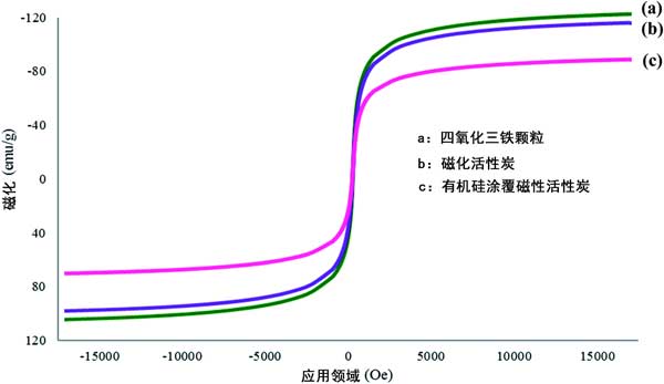 在這項研究中使用VSM來檢查合成活性炭的磁強(qiáng)度。對Fe 3 O 4顆粒,磁性活性炭和機(jī)硅涂覆磁性活性炭進(jìn)行了研究,以研究它們在涂覆時的磁強(qiáng)度趨勢。幾種材料的磁滯回線分別示于圖1(a)-(c)。根據(jù)獲得的結(jié)果。由于存在非磁性活性炭和有機(jī)硅表面活性劑涂層,磁強(qiáng)度似乎下降了。這確認(rèn)涂覆過程成功。但是,盡管在涂覆最終材料機(jī)硅涂覆磁性活性炭時磁化強(qiáng)度降低,但其磁強(qiáng)度仍在可接受的范圍內(nèi),并且強(qiáng)度足以在吸附過程中進(jìn)行。