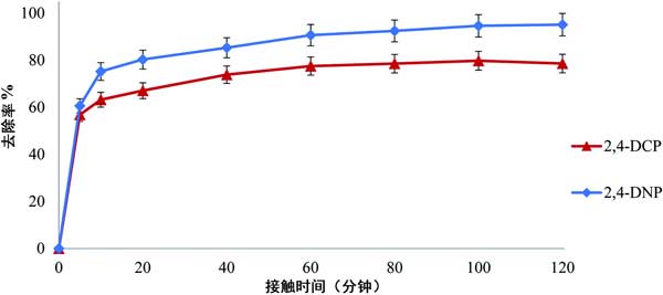 圖3:接觸時間對去除2,4-DNP和2,4-DCP的影響。