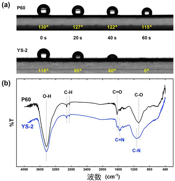 圖1:(a)用疏水和親水活性炭制造的兩個(gè)電極的接觸角隨時(shí)間變化,以及(b)兩種活性炭的FT-IR光譜。