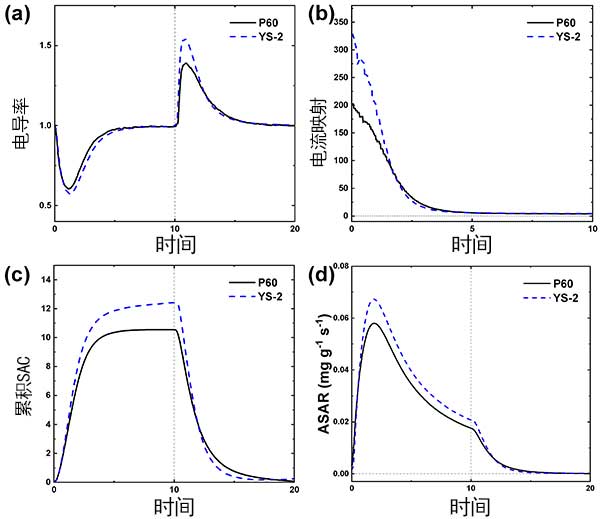圖2以(a)歸一化電導(dǎo)率曲線表示使用疏水和親水活性炭電極的電容去離子性能。如圖2a所示,在充電步驟期間,與疏水活性炭電極相比,歸一化電導(dǎo)率在親水活性炭電極的情況下顯示出更低和更寬的下降。對(duì)于親水活性炭電極,在充電步驟開始時(shí),圖2b中所示的特定電流也顯得較高。圖2的a,b在電容去離子表明更多離子在充電步驟中的初始幾分鐘吸附在親水活性炭電極的表面上。這意味著在親水活性炭電極上可以更快,更高地吸附鹽?梢酝茢,由于水分子更容易進(jìn)入微孔,因此親水活性炭電極上離子的可及表面積大于疏水活性炭電極上的離子的可及表面積。