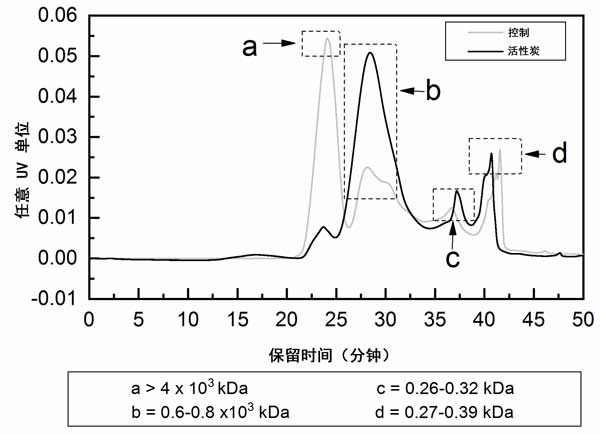 為了檢驗(yàn)活性炭改變可溶性微生物組成,使其對(duì)膜具有更高的親和力這一假設(shè),通過GPC分析了構(gòu)成可溶性微生物的有機(jī)分子的大小分布(圖1)。在第二次可溶性微生物運(yùn)行結(jié)束時(shí)收集了可溶性微生物樣品(圖1b),有趣的是,GPC色譜圖顯示了對(duì)照反應(yīng)堆和活性炭加入反應(yīng)堆之間的明顯差異。在活性炭反應(yīng)器的可溶性微生物中,保留時(shí)間為24分鐘時(shí),來自對(duì)照反應(yīng)器的可溶性微生物的第一個(gè)峰顯著降低,而在活性炭反應(yīng)器的可溶性微生物中,在28分鐘時(shí)觀察到峰的上升(圖1,分別是峰值a和b);钚蕴糠磻(yīng)器的可溶性微生物中的37分鐘處的峰也升高(峰c)。可溶性微生物中某些有機(jī)化合物含量的變化(升高或降低)可能歸因于,由于微生物群落組成的變化或某些活性炭所觀察到的代謝活性增強(qiáng),導(dǎo)致某些微生物產(chǎn)品的產(chǎn)生和分泌增加另外,或抑制進(jìn)水橄欖油廢水中物質(zhì)的降解。有機(jī)化合物對(duì)活性炭顆粒的吸附只會(huì)降低其在可溶性微生物中的外觀。由于吸附到活性炭上,可溶性微生物中某些成分的減少(如峰a所示)也有可能優(yōu)先吸附其他成分,這些成分對(duì)通量的減少更不利,或者起膜調(diào)節(jié)前體的作用,這可能會(huì)增強(qiáng)生物膜的生長(zhǎng)(例如峰b–d)。顯然,確定膜上有機(jī)污染物的身份是一項(xiàng)必不可少的任務(wù),目前,尚不清楚不同可溶性微生物組分對(duì)膜污染的詳細(xì)影響以及它們被活性炭的吸附。