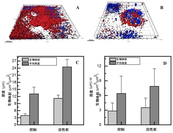 為了分析由于在膜生物反應(yīng)器中添加活性炭而導(dǎo)致生物膜形成增加的可能性,并進(jìn)一步闡明活性炭反應(yīng)器中膜性能下降幅度更大的原因,在第一個(gè)處理結(jié)束時(shí)進(jìn)行了檢測(cè)(圖2A,B)。在比較兩個(gè)反應(yīng)器之間生物膜結(jié)構(gòu)的性質(zhì)時(shí),可以觀察到活性炭反應(yīng)器通量下降的增加顯然與生物膜生長(zhǎng)的幅度有關(guān)。在第一次膜生物反應(yīng)器運(yùn)行結(jié)束時(shí)從模塊上獲取的兩塊膜上生物膜的CLSM分析顯示,活性炭和對(duì)照反應(yīng)器之間細(xì)胞的生物體積及其自相關(guān)EPS的差異很大(圖2)。當(dāng)補(bǔ)充活性炭時(shí),生物膜生長(zhǎng)的升高支持了膜滲透性的更高降低,這是由可溶性微生物組分吸附的升高引起的,這可能會(huì)更好地調(diào)節(jié)膜表面,從而增強(qiáng)生物膜的形成。