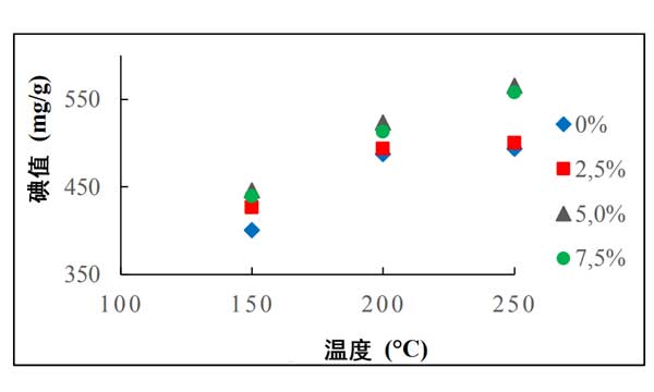 從圖1可以看出,熱解溫度具有增加活性炭和木炭的碘值的作用,因?yàn)樗黾恿藷峤夥磻?yīng)器中的壓力,從而促進(jìn)了碳鏈的斷開。這也導(dǎo)致了轉(zhuǎn)移碳的數(shù)量增加。會(huì)在熱解過程中誘發(fā)碳?xì)浠衔锖推渌袡C(jī)化合物的分解。此外,它增加了木炭和活性炭孔的表面積。