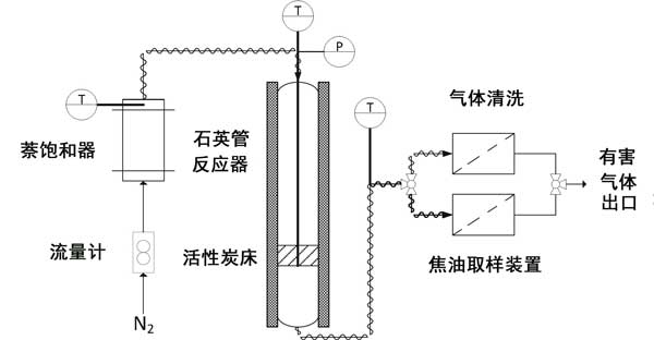 萘轉(zhuǎn)化試驗(yàn)已在圖1所示的實(shí)驗(yàn)設(shè)備中進(jìn)行,該設(shè)備顯示了其主要部分:進(jìn)料系統(tǒng),反應(yīng)器,采樣/清潔裝置和氣體分析儀。進(jìn)料系統(tǒng)由用于調(diào)節(jié)氮?dú)饬髁康霓D(zhuǎn)子流量計(jì)和萘飽和器組成,以獲取摻有焦油的物流。飽和器和反應(yīng)器之間的管道應(yīng)保持在150°C以上,以免萘發(fā)生冷凝。所使用的反應(yīng)器是內(nèi)徑為14 mm,總高度為600 mm的立式管狀石英反應(yīng)器。將活性炭床放在反應(yīng)器內(nèi)部的玻璃粉上方,該玻璃粉位于距頂部430毫米處。床的溫度通過(guò)K型熱電偶在床的中央進(jìn)行測(cè)定。在焦油采樣期間,通過(guò)切換三通閥,將反應(yīng)器出口處的氣體導(dǎo)入采樣裝置,并在其余時(shí)間內(nèi)導(dǎo)入清潔裝置。采樣裝置由三個(gè)撞擊器組成,在0°C時(shí)充滿異丙醇。專(zhuān)用實(shí)驗(yàn)表明,在本研究分析的條件下,該設(shè)備的捕獲效率超過(guò)99%。借助帶有熱導(dǎo)檢測(cè)器(TCD)的微型氣相色譜儀分析清潔區(qū)出口處的氣體,以在線測(cè)定短鏈烴(從乙炔到苯)和分子氫。實(shí)驗(yàn)裝置的更多詳細(xì)信息可以在其他地方找到。