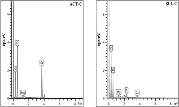 各種尺寸的活性炭和磺化炭的SEM圖像形態(tài)如圖1所示。。ACT-C和SUL-C催化劑的SEM圖像表明,白點代表無機(jī)成分。從圖像可以看出,活性炭具有不規(guī)則的致密結(jié)構(gòu),而顆粒看起來像具有光滑表面的顆粒。圖2顯示了ACT-C和SUL-C催化劑的EDX圖,并觀察到SUL-C圖中存在硫。此外,在ACT-C和SUL-C的圖中,還有一些額外的峰涉及雜質(zhì),因為碳源是廢物生物質(zhì),因此可能存在這些雜質(zhì)。如圖3所示,通過TEM分析了活性炭和磺化炭的形態(tài)和結(jié)構(gòu)。該TEM圖像ACT-C催化劑的“A”表示僅存在微孔,而SULC催化劑則顯示了“微孔”和“中孔”,這是由于活性炭材料上的磺化作用所致,在活性炭材料中產(chǎn)生了中孔。