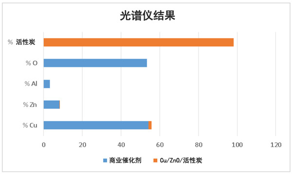 活性炭催化劑的制備,采用浸漬法制備了Cu/ZnO/活性炭催化劑。硝酸銅和硝酸鋅是將附著在活性碳上的銅和氧化鋅載體的原材料。Zn起促進(jìn)劑的作用,以防止Cu的燒結(jié)。銅將在催化劑上被氧化并寫為銅[Zn]。之后,來自CuO分子將為CuO/ZnO相的形式。其還原將受到ZnO的影響。制備活性炭催化劑后,然后通過XRF,XRD,SEM和BET表面積分析儀對催化劑進(jìn)行表征。商業(yè)催化劑和Cu/ZnO/活性炭催化劑的XRF分析見圖2。