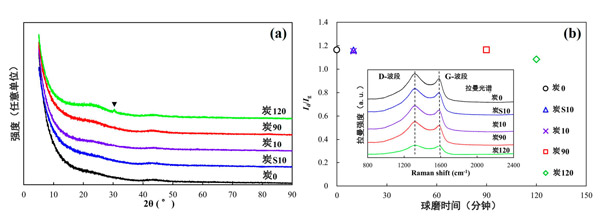 圖1:XRD圖案和研磨時間之間的關(guān)系和活性炭的值。(a)X射線衍射圖案,(b)拉曼光譜值。