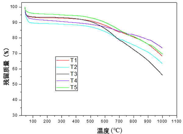 根據圖3,不同的處理導致熱分解曲線有所不同。此外,不同處理的殘留質量也有所不同,處理T1,T4和T5呈現(xiàn)更高的殘留質量,表明這些處理具有更高的耐熱性。處理T2和T3的殘留量較低,表明處理的耐熱性較低。此外,這些處理在后期殘留質量之間存在重大差異而脫穎而出。根據處理(電擊時間),降解曲線的差異可能與表面上不同官能團的存在有關。在熱過程中,由于存在的官能團,會形成不同的產物,從而導致更高或更低的質量損失,因為活性炭的熱分解反應了其表面上官能團的存在。然后,官能團的類型和數(shù)量都會影響熱重曲線。但是,由于表面官能團的降解與其結構不同,因此官能團的類型具有更大的影響,并且可以解釋處理之間的差異。