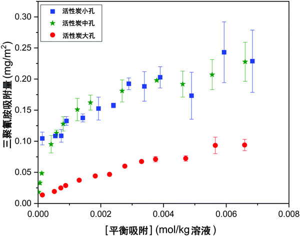 圖2:三聚氰胺在30°C下在三種活性炭的吸附等溫線(xiàn),通過(guò)活性炭表面積標(biāo)準(zhǔn)化。