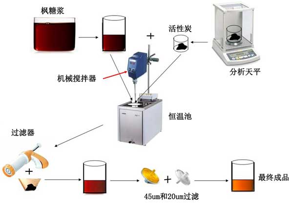 根據(jù)實驗測試活性炭使黑楓糖漿變色的機制,使用食品級活性炭作為吸附材料,以改善深色楓糖漿的顏色和氣味/味道,從而生產(chǎn)與淡糖漿或琥珀色糖漿。圖1說明了該測試中使用的變色過程。為了進行實驗,我們使用了不同量的活性炭(0.01、0.03和0.05 g),并引入10 mL楓糖漿樣品中,以得到0.1、0.3和0.5g/100 mL的最終濃度。然后,將混合物放入恒溫池中,以便通過使用電動攪拌裝置來調(diào)節(jié)工作溫度和攪拌速度。攪拌(混合)時間設(shè)置為20、40和60分鐘。在混合時間結(jié)束時,首先通過使用簡單的紙過濾器過濾混合物,以去除使用過的活性炭的大顆粒。通過使用兩個分別具有45和20μm的篩孔尺寸的注射器過濾器進行第二次過濾。