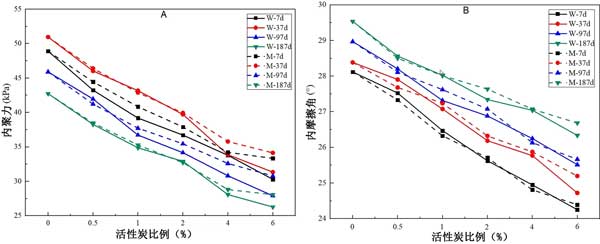 圖3:活性炭對植被混凝土的內聚力(A)和內摩擦角(B)的影響。