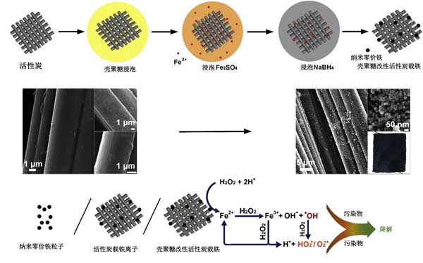 本次一共制備了三種類型的非均相Fenton催化劑,分別是納米零價鐵顆粒,活性炭負(fù)載的納米零價鐵和浸漬有納米零價鐵的殼聚糖改性活性炭。通過在活性炭上吸收鐵離子,然后使用NaBH 4原位還原,合成了活性炭負(fù)載的納米零價鐵。殼聚糖改性活性炭的制備方法是,先在酸洗過的活性炭上涂覆一層殼聚糖,然后將亞鐵離子螯合到殼聚糖基質(zhì)中,然后將其原位還原為納米零價鐵。這幾種活性炭催化劑的合成過程示意圖如圖1所示。