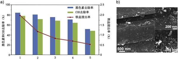 檢查了活性炭催化劑的可重復(fù)使用性,以評估其是否經(jīng)過了多個循環(huán)的黑色素處理。圖3顯示了五個處理周期的COD和脫色以及鐵浸出的結(jié)果。一個。盡管觀察到4個循環(huán)后,脫色效率從85%逐漸降低到70%,但是,可以證明活性炭催化劑在Fenton反應(yīng)中具有合理的可重復(fù)使用性。效率的降低可歸因于吸附降解副產(chǎn)物時某些催化劑位點的失活以及在Fenton反應(yīng)過程中少量鐵的浸出。在每個循環(huán)后對鐵的浸出進(jìn)行了研究,以表明活性炭的穩(wěn)定性。如圖3所示a,在第一個循環(huán)中浸出鐵離子的量最高,約為初始鐵量的2%。在第三個循環(huán)后,浸出鐵降至<1%,并且在隨后的循環(huán)中保持穩(wěn)定,在第五個循環(huán)時降至0.5%。與將鐵離子浸入溶液中的單獨的納米零價鐵相比,在Fenton類工藝中,亞鐵離子和鐵離子可能會被活性炭吸附/螯合,從而避免了浸出并使反應(yīng)連續(xù)供入。零碎的鐵損失顯然是活性炭催化劑再利用以及減少鐵淤渣的重要步驟。