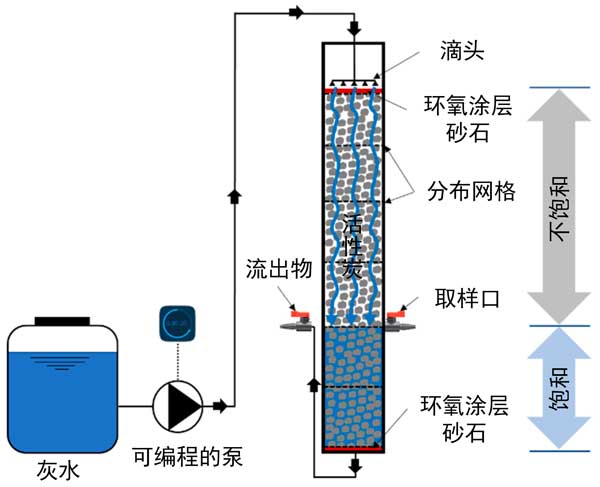 圖1:用于灰水處理的實(shí)驗(yàn)室規(guī)模的單級(jí)不飽和飽和活性炭濾池的示意圖。