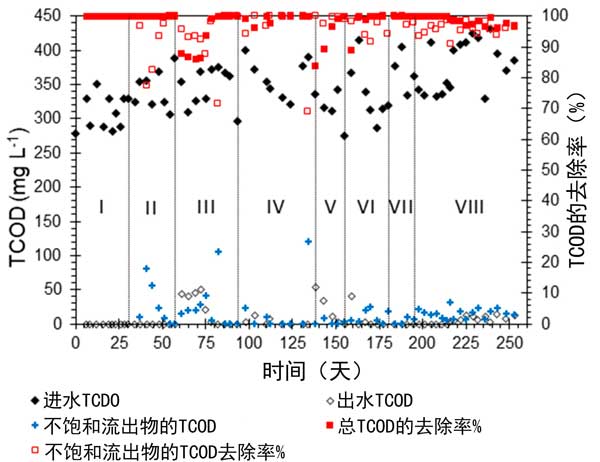 圖2:進(jìn)水中不飽和廢水和總廢水中總化學(xué)需氧量的濃度以及兩種廢水中的去除百分率隨活性炭運(yùn)行時(shí)間的變化(d)。