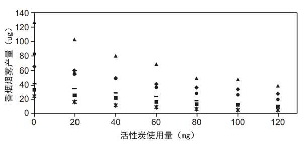 測(cè)試過程中我們?cè)跓o炭和以20毫克至120毫克的六種重量增量添加活性炭來測(cè)試香煙。桿端和嘴端的醋酸纖維素長(zhǎng)度段始終保持恒定。最大的空腔填充值用于所有負(fù)載,因此,總的過濾器長(zhǎng)度增加了約50%。每使用15毫克活性炭增加1毫米。如前所述,所有香煙都在35/2/60的條件下進(jìn)行調(diào)理和抽煙。每個(gè)濾嘴負(fù)載量高為120mg時(shí)添加活性炭對(duì)焦油和尼古丁的收率(即顆粒相)的影響很小,這可能是由于較長(zhǎng)的濾嘴導(dǎo)致了額外的機(jī)械過濾。對(duì)于所有測(cè)得的蒸氣,隨著活性炭載量的增加,產(chǎn)率都有所下降。這在圖1中以圖形方式顯示(僅出于清晰目的使用一定范圍的蒸氣),其中乙醛/丙酮值乘以0.1以進(jìn)行縮放。
