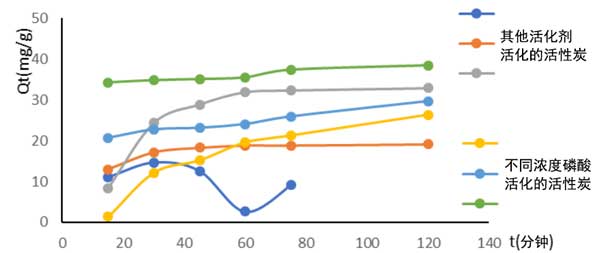 活性炭的吸附時間影響可從圖1看出,活性炭吸附分三步進行:第一是在最初的30分鐘內,污染物的吸附量很快就被確定了,這可以用在吸附劑的外表面存在大量空置的結合位點,這使得吸附劑易于吸附到該表面。第二在31分鐘后,吸附速率降低,過程緩慢;钚蕴康钠渌恢眠_到飽和后,污染物顆粒將遷移到吸附劑內部。由于易于接近,因此吸附過程緩慢:顆粒內擴散。第三從80分鐘開始,我們觀察到一次接觸,活性炭已達到其最大容量。我們可以說這些吸附劑的平衡時間是80分鐘。然而,磷酸活化的活性炭吸附量的演化曲線顯示,在最初的30分鐘內,污染物的吸附量顯著增加,此后,污染物的吸附量急劇下降,這將是一種產物解吸。這一現(xiàn)象在其他吸附劑中是不可見的,這可能意味著可用孔隙的數(shù)量和結合力隨著所用活化劑濃度的增加而增加,這一點還通過碘值和亞甲基藍的值進行了驗證。