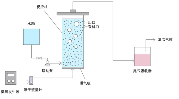 臭氧的反應裝置如圖1所示。它主要由高硼硅酸鹽玻璃和臭氧發(fā)生器制成。反應器高度為500mm,外徑和內(nèi)徑分別為70和65mm,有效容積為1.5L。反應器中臭氧氣體的流量可控制在100mL分鐘以內(nèi)。反應器中的氣體分配器是鈦板,其孔隙率約為20%至30%,微孔的平均孔徑約為17μm。臭氧反應尾氣的吸收溶液為濃度為1.5mol/L。對色度為600的模擬水楊酸異羥肟酸廢水500mL進行采樣,并將其放入燒杯中。將制得的活性炭量0.03、0.06、0.09、0.12、0.15和0.18g/L樣品分別添加到前一溶液中,然后用磁力攪拌器混合以達到吸附平衡,分析處理后的上清液的色度以評價處理效果。