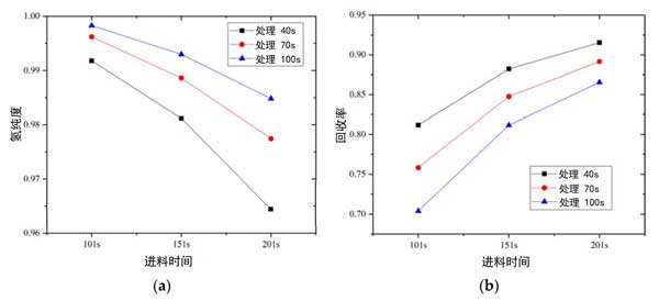 活性炭?jī)艋瘯r(shí)間的影響如圖2所示。當(dāng)吹掃時(shí)間從40秒增加到70秒時(shí),氫氣純度提高了0.44–1.35%,氫氣回收率降低了2.61–6.57%。當(dāng)吹掃時(shí)間從70秒增加到100秒時(shí),氫氣純度提高了0.21-0.76%,氫氣回收率降低了2.91-7.19%。隨著吹掃時(shí)間的增加,在吹掃步驟中氫氣的摩爾分?jǐn)?shù)增加,因?yàn)楦嗟牟患儦怏w從吸附劑中解吸出來(lái)。因此,隨著吸附劑的循環(huán)利用,這些雜質(zhì)的摩爾分?jǐn)?shù)降低,因此隨著凈化時(shí)間的增加,氫純度也隨之提高。但是回收率下降了,當(dāng)進(jìn)料時(shí)間短并且吹掃時(shí)間增加時(shí),氫純度變化率降低,并且氫回收率變化率增加。