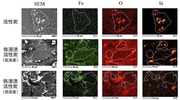 圖2:帶有鐵,氧和二氧化硅的的活性炭和浸漬活性炭的SEM-EDS圖像。