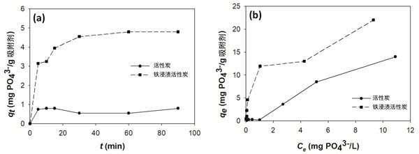 圖3:(a)磷酸鹽在活性炭和浸漬活性炭上的吸附動(dòng)力學(xué),以及(b)對磷酸鹽的吸附等溫線。