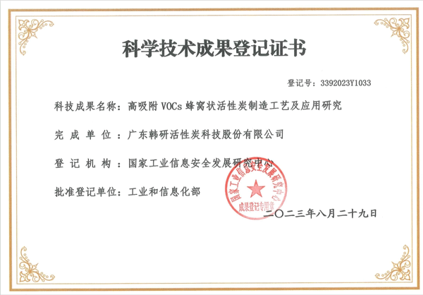 本次科學技術成果鑒定由國家工業(yè)信息安全發(fā)展研究中心依據(jù)《中華人民共和國科學技術進步法》、《中華人民共和國促進科技成果轉化法》、《科學技術評價辦法》、《科技評估管理暫行辦法》,在北京主持召開由韓研股份研發(fā)的“高吸附 VOCs 蜂窩狀活性炭制造工藝及應用研究”科技成果評價會。期間嚴格按照《科技成果評價試點暫行辦法》的有關規(guī)定和要求,秉承客觀、公正、獨立的原則,聘請專家對該項科技成果進行評價。評價委員會聽取了項目完成單位的技術總結報告,對評價資料進行了審查,經(jīng)嚴格質詢和充分討論形成一致意見:本技術成果達國際先進水平。