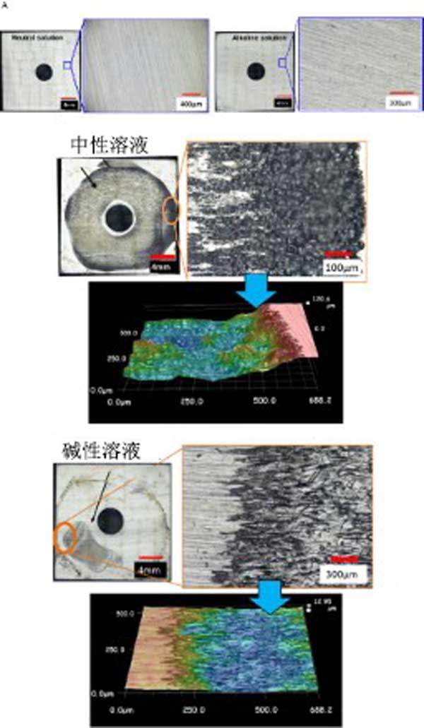使用光學(xué)顯微鏡觀察實驗后樣品的表面形態(tài),如圖3所示。在中性和堿性溶液中未與活性炭接觸的樣品中未觀察到縫隙腐蝕。另一方面,在中性和堿性測試溶液中與活性炭接觸的樣品上發(fā)生縫隙腐蝕。這些結(jié)果清楚地表明,當樣品與活性炭接觸時,縫隙腐蝕敏感性增加。在中性測試溶液的情況下,最大腐蝕深度為130μm并且縫隙腐蝕傳播以覆蓋樣品的幾乎所有褶皺區(qū)域。在堿性測試溶液的情況下,最大腐蝕深度為25μm并且腐蝕區(qū)域遠小于中性溶液的情況。這些結(jié)果表明,在中性溶液的情況下腐蝕區(qū)域和深度更大,這表明在吸附塔中發(fā)生實際腐蝕。在堿性溶液的情況下腐蝕面積和深度較小的原因被認為是Fe(OH)2的溶解速率的事實堿性溶液減少,這導(dǎo)致腐蝕速率降低;旧希陉枠O部位的pH降低至去鈍化pH是縫隙腐蝕開始和傳播所必需的。考慮到這個方面,還可以解釋縫隙腐蝕行為的差異。