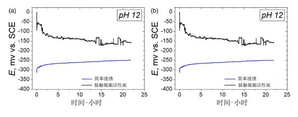 中性和堿性溶液中試樣的開路電位隨時間的變化如圖4所示。與銀浸漬活性炭接觸的樣品的開路電位在最初階段是高的,然后在中性和堿性溶液的實驗開始時急劇下降。根據(jù)這些結(jié)果,認為在實驗開始時發(fā)生縫隙腐蝕,當樣品與銀浸漬活性炭接觸時開路電位降低。結(jié)果表明“電化學(xué)效應(yīng)”是嚴重縫隙腐蝕的主要原因。